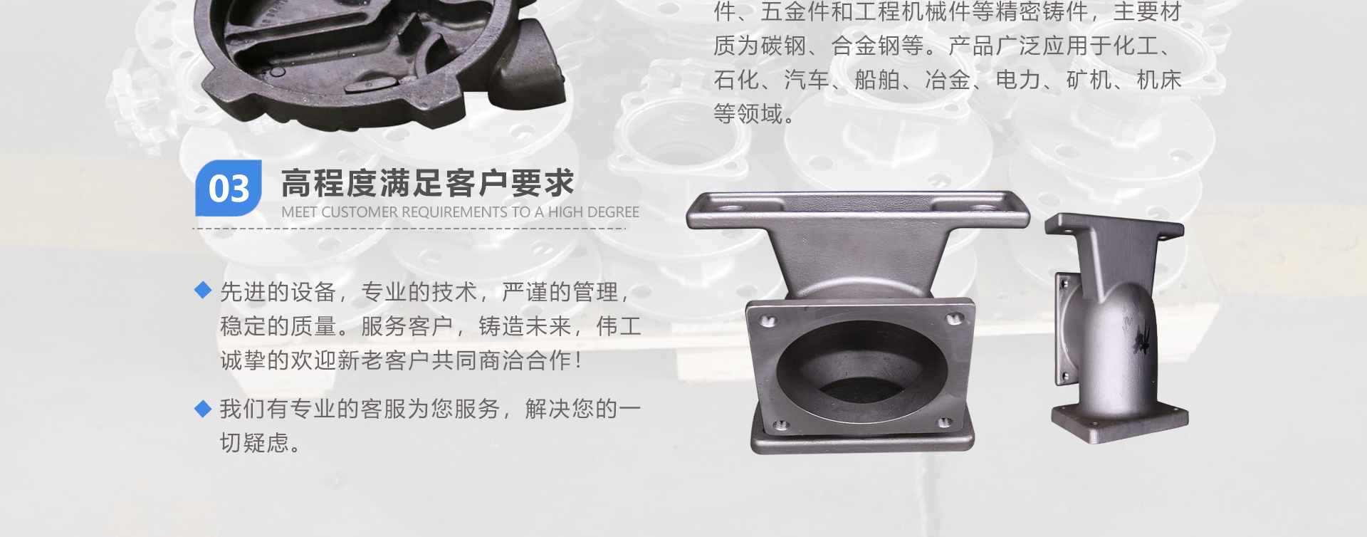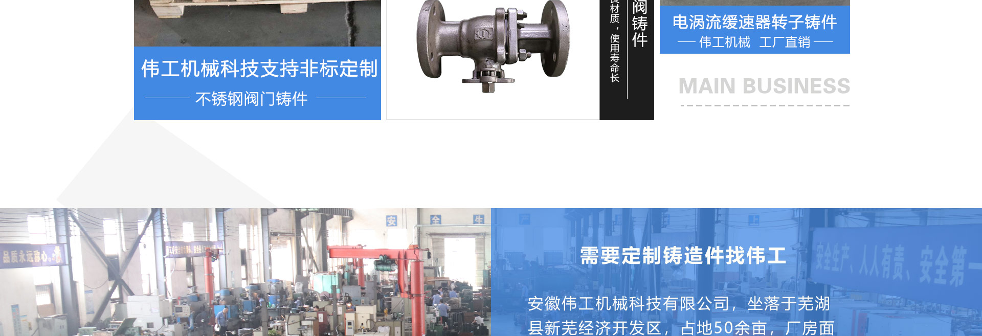 安徽偉工機(jī)械科技有限公司,坐落于安徽蕪湖新蕪經(jīng)濟(jì)開(kāi)發(fā)區(qū),是一家専業(yè)從事鑄造產(chǎn)品設(shè)計(jì)、研發(fā)、生產(chǎn)、銷(xiāo)售于一體的企業(yè),公司為客戶的產(chǎn)品提供多樣的技術(shù)支持與設(shè)計(jì),公司主要鑄造技術(shù)有潮模砂鑄造、硅溶膠精鑄工藝。主要產(chǎn)品有:不銹鋼閥門(mén)配件、泵閥配件、汽車(chē)配件、工業(yè)管道配件、工程機(jī)械配件、汽車(chē)配件等。材質(zhì)為:低合金鋼、304、316、316L、鉻鉬鋼、哈氏合金、碳鋼、雙相鋼等。公司已先后通過(guò)ISO9001和TS16949等多種體系審核,以完備的管理手段和齊全的檢測(cè)設(shè)備滿足客戶需求,進(jìn)的設(shè)備,専業(yè)的技術(shù),嚴(yán)謹(jǐn)?shù)墓芾恚€(wěn)定的質(zhì)量。服務(wù)客戶,鑄造未來(lái),偉工誠(chéng)摯的歡迎新老客戶共同商洽合作